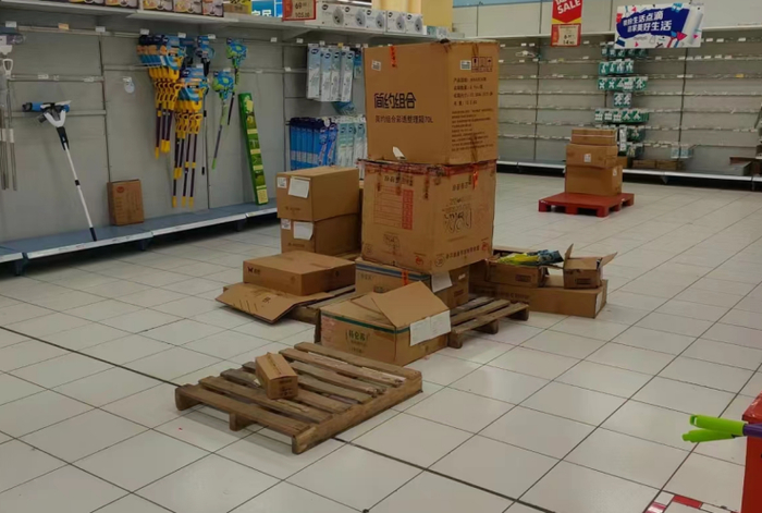 有人后知后觉,跑去家附近的华润万家,发现产品折上折随处可见,不少货架、冷柜都被清空,店内不少货物纸箱也随意堆放,显然已经“人去楼空”。