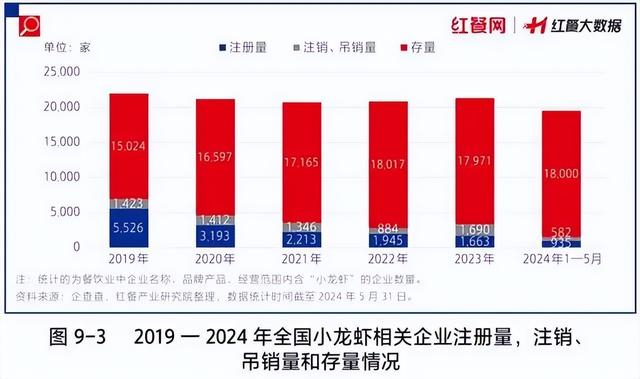 而从整个行业来看,经历过前些年的“小龙虾顶流”时期,近几年这个赛道的增速已稍有下滑。据红餐网2024年报道,截至2024年9月上旬,我国小龙虾相关企业注册量为1442家,同比减少5.2%;小龙虾相关企业存量为17900家,同比减少3.2%。