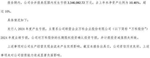万科2024年财报显示,其全年营收下降约26%,净利润更是大幅下滑,直接拖累了深铁集团的整体业绩。深铁集团在2024年因万科业绩亏损,对其长期股权投资确认投资亏损,并计提投资减值损失,这一亏损在合并报表中体现为334.6亿元的巨额亏损,超过了过去五年净利润的总额。