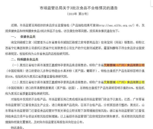 自爷爷的农场产品上市销售以来,其多次被各级监管部门检出不合格。2019年6月,其婴幼儿米粉和果泥因钠、碘含量低于产品标签明示值的80%,被国家市场监管总局通报;2020年,其中国经销商艾斯普瑞(广州)食品有限公司因2批次米粉不合格,被罚没29万元;2021年4月,海关总署进一步通报,爷爷的农场一批次进口自比利时的婴幼儿大米粉因钙含量不符合国家标准要求被拒绝入境。