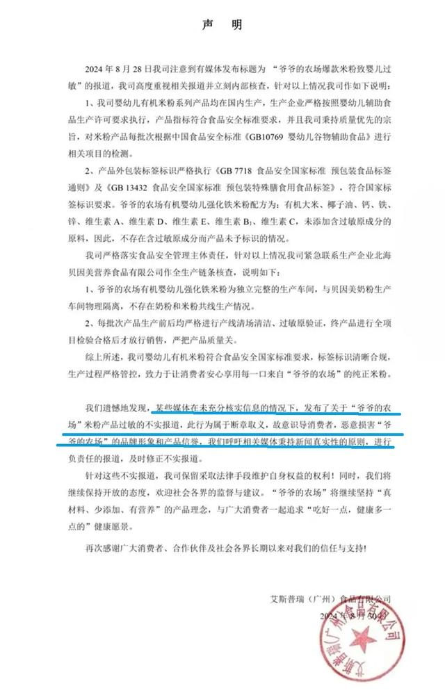 爷爷的农场则回应称公司紧急联系生产企业北海贝因美营养食品有限公司作全生产链条核查,不存在奶粉和米粉共线生产情况。