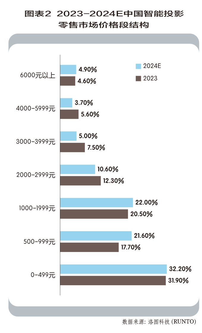 通过对比2023年与2024年中国智能投影零售市场价格段结构,能够看出,一方面,低端价格带占比最高,且占比呈现上升趋势。2023年与2024年,0-499元价格段占比最高,分别为31.9%、32.2%,而2000元以下的价格占比总和分别为70.1%、75.8%。另一方面,中端投影仪占比降低,高端投影仪占比还较低,但增长明显。2023年与2024年,2000-5999元价格段占比分别为25.4%、19.3%。(图表2)