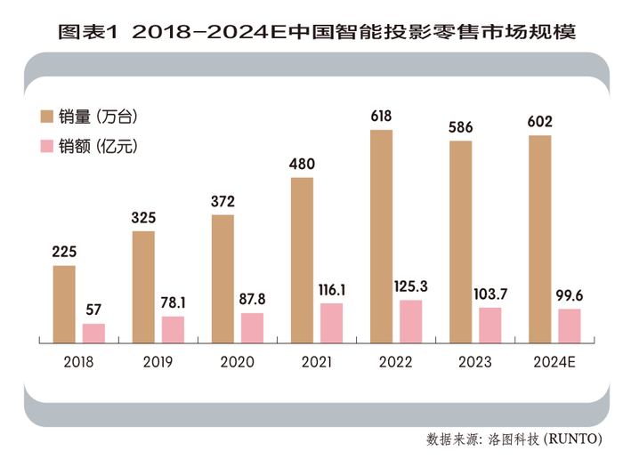 2018年到2022年,中国智能投影零售销量从225万台迅速增长到618万台,随后2023年到2024年的短短两年时间内,行业生态出现明显变化——消费需求减弱、行业竞争加剧、市场迅速降温。
