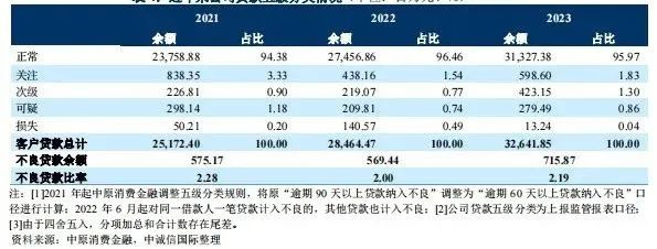 见下图,中原消费金融贷款五级分类情况,2023年中原消费金融不良贷款余额较2022年增长25.71%至7.16亿元,不良贷款率上升0.19个百分点至2.19%,关注贷款余额也由2022年的4.38亿元增长36.61%至5.99亿元,占贷款余额的1.83%。