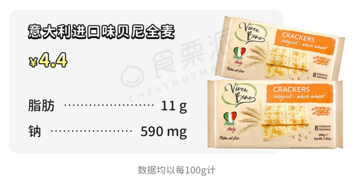这个饼干有全麦、非全麦两个版本,全麦版本加了全麦粉、小麦麸皮,每100g饼干有5.7g纤维;如果为了“好消化”吃苏打饼干,那建议选择非全麦的。
