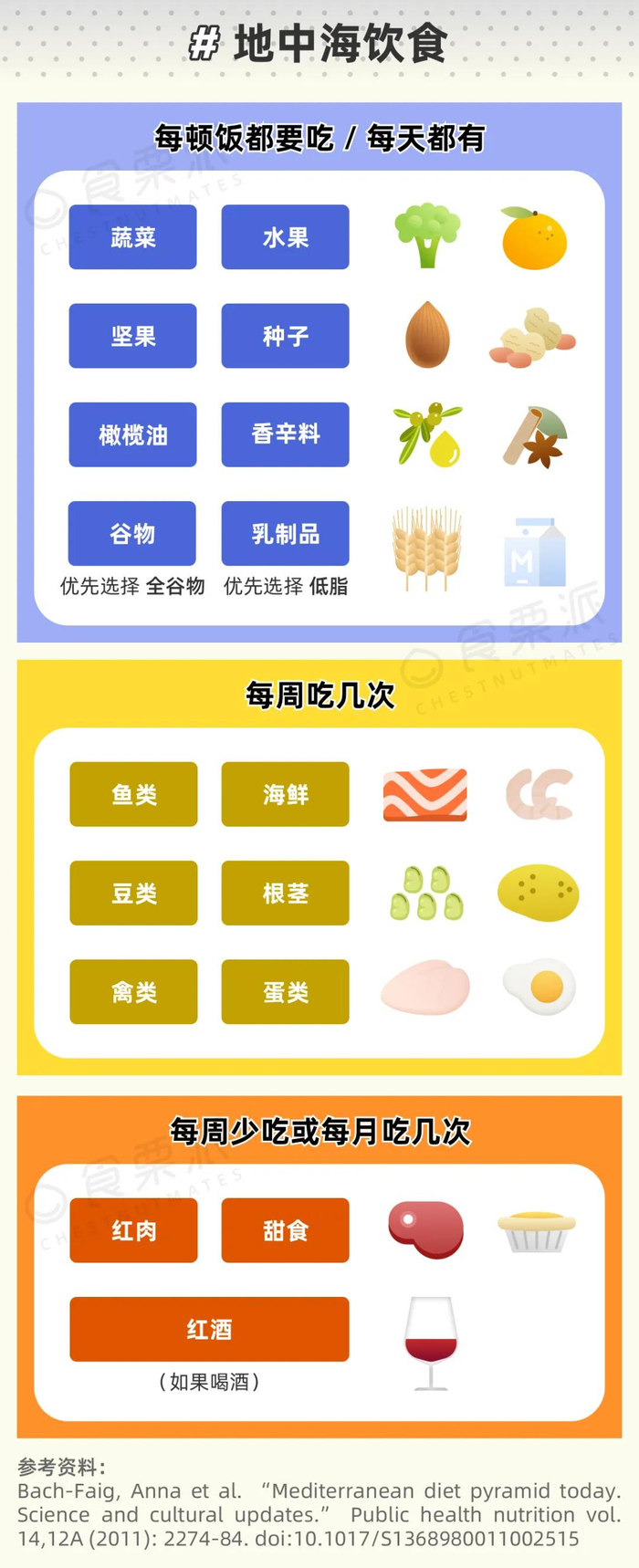 地中海饮食是一个高单不饱和脂肪的饮食,比如橄榄油、坚果和种子食物;对于甜食和酒精饮品(红酒)不绝对禁止。