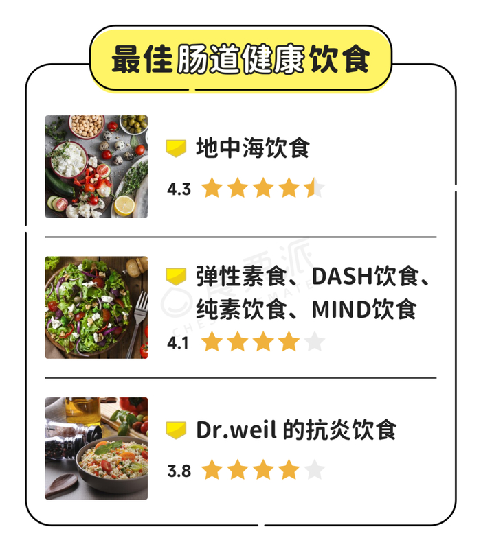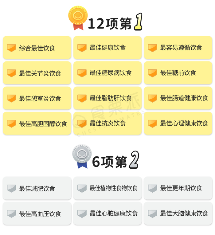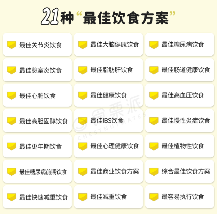 除了往年都有的“综合最佳饮食”、“最容易遵循饮食”、“最佳减重饮食”等榜单之外,今年还增加了关节炎、憩室炎、脂肪肝、高血压、高胆固醇、IBS、更年期、糖前期、大脑健康、心理健康、肠道健康、最佳抗炎饮食等12个榜单。