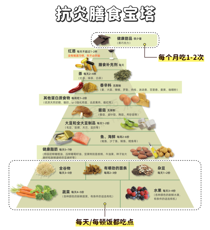 需要强调的是,没有任何单一的食物或营养素直接起到抗炎作用,需要多种食物和营养协同起作用。不论是地中海饮食,还是Dr.Weil的抗炎饮食,重要的是整体饮食结构,而不是单一的食物或者营养素。