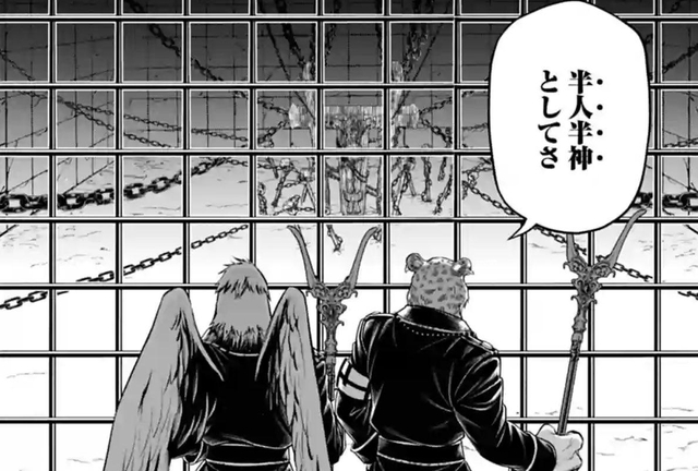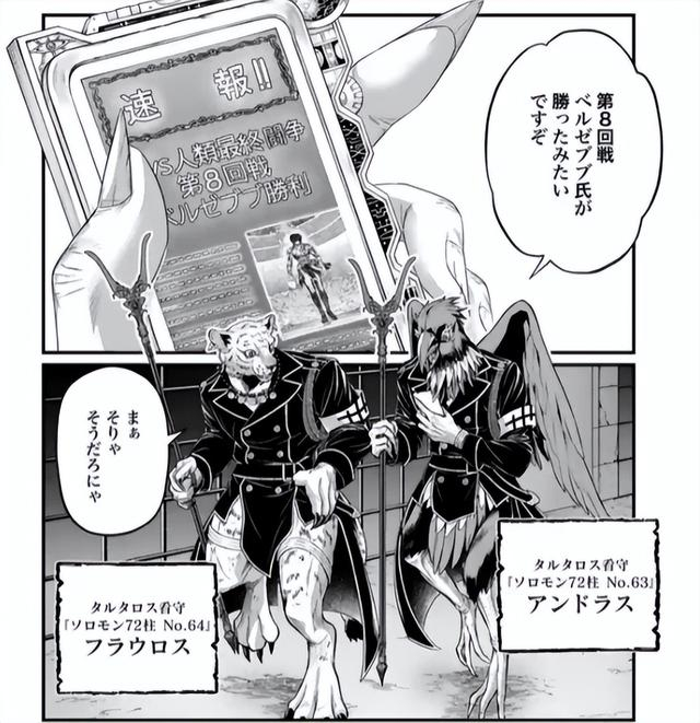 与此同时,冥界深处的“地狱”中,两名看守正在用手机查看“诸神黄昏”第八战的结果,这两名看守正是所罗门72柱魔神中的弗劳伦斯和安朵斯。听到两名看守说第八战打平了,某个房间中的犯人也露出了惊讶的表情,说没想到会是这样的走向。
