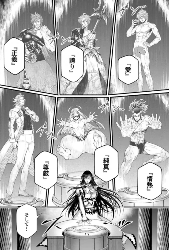 而就在第九场比赛即将开始的时候,布伦希尔德独自一人来到了一个酷似神殿的房间中,她先后念出了八个词“喜悦”“爱”“荣耀”“正义”“热情”“纯真”“尊严”“前进”,之前在诸神黄昏中战死的八位代表的全息影像都在房间中出现了。