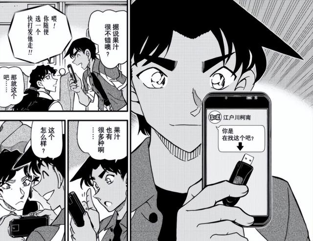 就在伊织无我疑惑U盘去哪的时候,服部平次拿着手机找到了伊织无我,他表面上询问伊织无我要喝什么果汁,实际上手机里显示着一张关于U盘的图片,发图片的人正是柯南。柯南用图片的方式询问伊织无我是不是在找U盘,然后还说要问伊织无我几个问题。