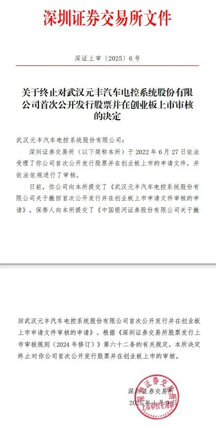 1月9日,深交所公告,因武汉元丰汽车电控系统股份有限公司、保荐人银河证券撤回发行上市申请,根据规定,深交所决定终止其发行上市审核。