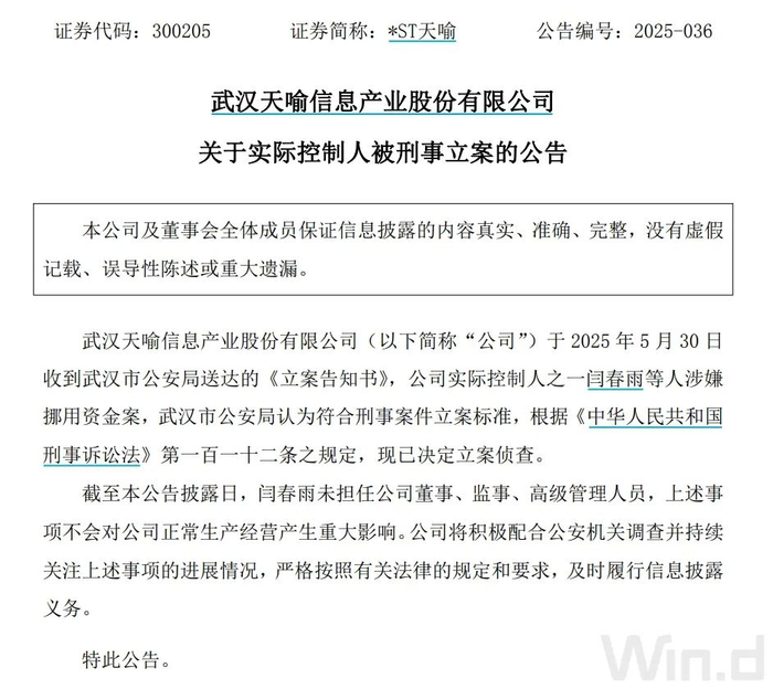 项乾消息:5月30日晚,*ST天喻(300205.SZ)发布公告称,公司于2025年5月30日收到武汉市公安局送达的《立案告知书》,公司实际控制人之一闫春雨等人涉嫌挪用资金案,武汉市公安局认为符合刑事案件立案标准,根据《中华人民共和国刑事诉讼法》第一百一十二条之规定,现已决定立案侦查。