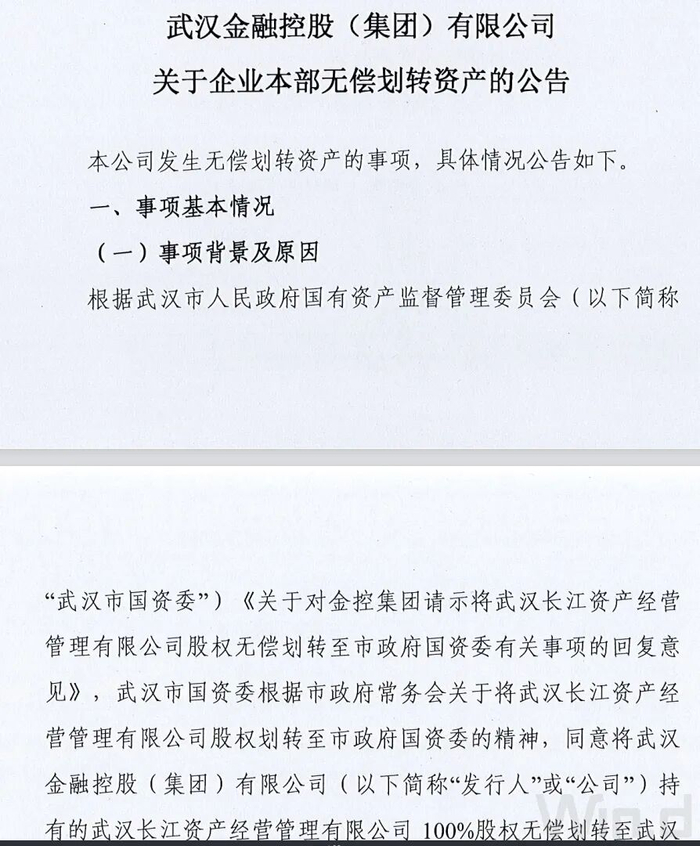 项乾消息:近日,武汉金融控股(集团)有限公司(102101536.IB)发布公告称,武汉市国资委同意将公司持有的武汉长江资产经营管理有限公司(下称:武汉长江资管)100%股权无偿划转至武汉市国资委。