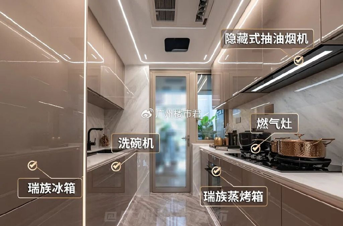 针对广东家庭钟爱的“镬气”小炒,项目采用全隐藏升降式油烟机可瞬间产生强大吸力,快速吸排油烟,确保厨房空气清爽。