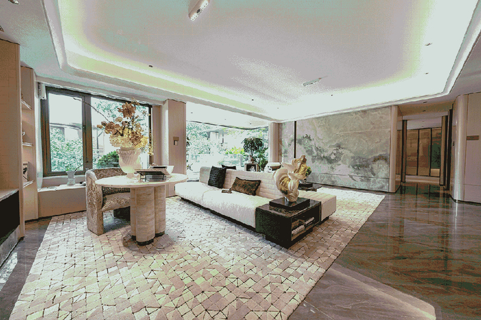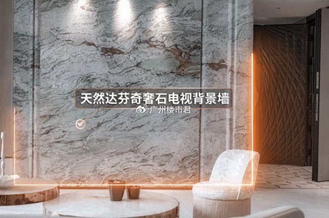 比如大户型选用天然达芬奇奢石铺陈电视背景墙,不仅耐磨性好,通透优雅,基底色泽温润。