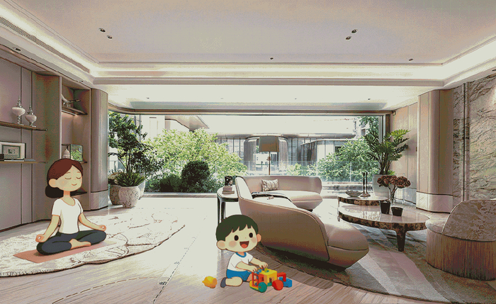 让楼市君很惊艳的一点,建面约170㎡客厅拥有约8.4米景观阳台,放上瑜伽垫、动感自行车,一边欣赏窗外郁郁葱葱的园景,一边轻松律动。