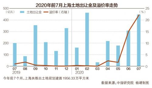 中指研究院数据显示,今年前7月,上海土地出让金收入达1795.30亿元,同比增长95.1%。其中,仅7月份的成交额就达443.62亿元。