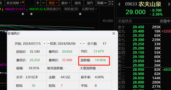 农夫山泉的律师函、消委会的道歉信都在为农夫山泉正名,但事实上,信任一但出现裂缝,想要完全修复谈何容易,更何况舆论的主角是本身就流年不利的农夫山泉。这一点从7月15日至8月6日,农夫山泉港股股价表现持续低迷,累计跌幅近15%中可见端倪。
