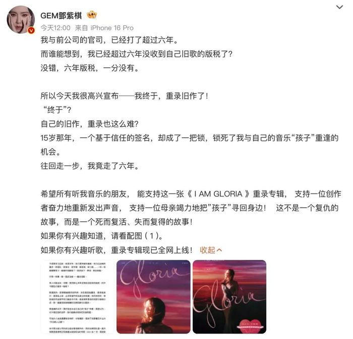 没有任何预告,6月12日,邓紫棋(G.E.M.)正式发布重录专辑《I AM GLORIA》,收录《泡沫》《睡公主》等12首旧作“重生版”。这场看似寻常的音乐发行,实则与华语乐坛一场至今已历时六年的知识产权拉锯战密不可分。