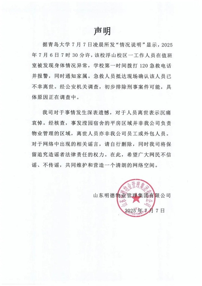 7月7日上午,山东明德物业管理集团发布声明称,经核查,事发滢园宿舍的平房区域并非该公司负责物业管理的区域,离世人员亦非该公司员工或外包人员。