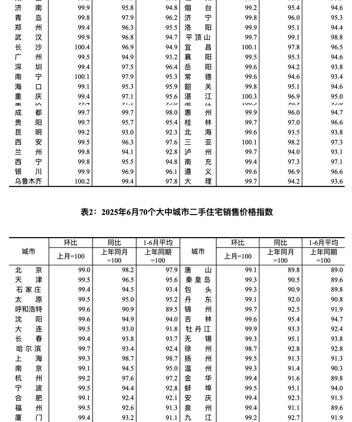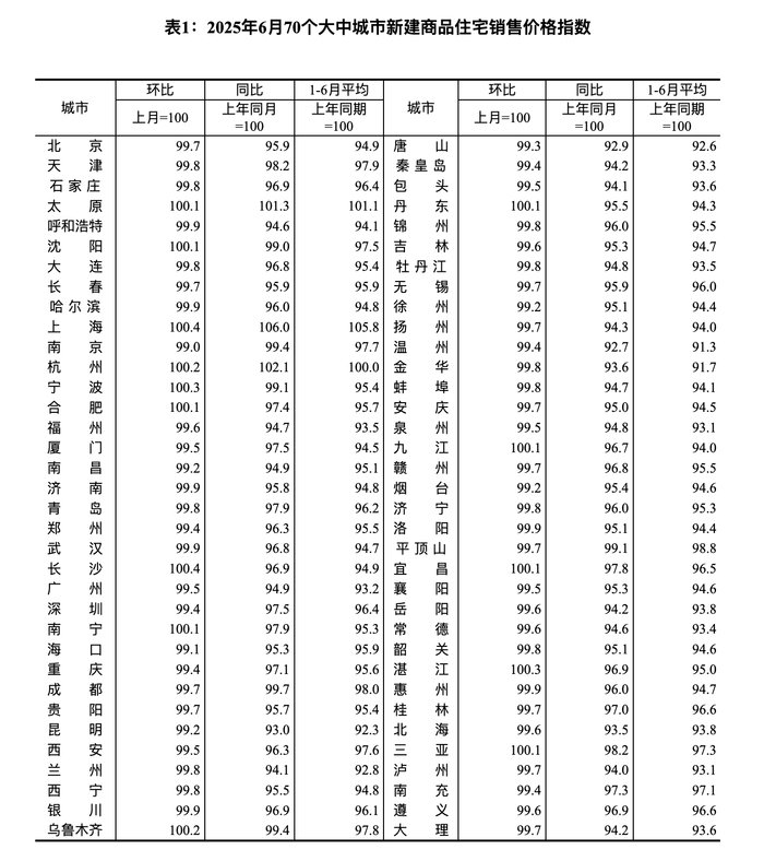7月15日,国家统计局发布数据,2025年6月份,70个大中城市中,各线城市商品住宅销售价格环比下降,同比降幅整体继续收窄。