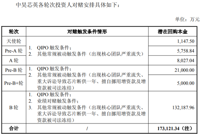 天普股份投资者说明会资料显示,截至9月16日,中昊芯英历次股权融资对赌协议所产生的或有负债约为17.31亿元,涵盖合格上市(QIPO)、业绩承诺、常规被动触发三类条件。其中,已有36名投资人签署回购豁免同意函,对应10.68亿元或有负债的回购条款被认定“自始无效”。未签署回购豁免同意函最大敞口为6.64亿元。
