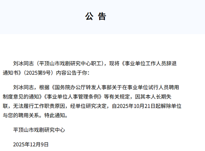 河南平顶山市戏剧研究中心12月9日在《平顶山日报》发布辞退公告。被辞退对象为平顶山市戏剧研究中心职工刘冰同志。公告称:刘冰同志,根据《国务院办公厅转发人事部关于在事业单位试行人员聘用制度意见的通知》《事业单位人事管理条例》等有关规定,因其本人长期失联,无法履行工作职责原因,经单位研究决定,自2025年10月21日起解除单位与您的聘用关系。