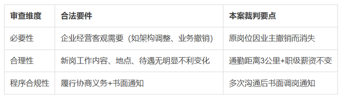 根据《劳动合同法》第35条及司法裁判规则,法院审查调岗争议的核心要素如下: