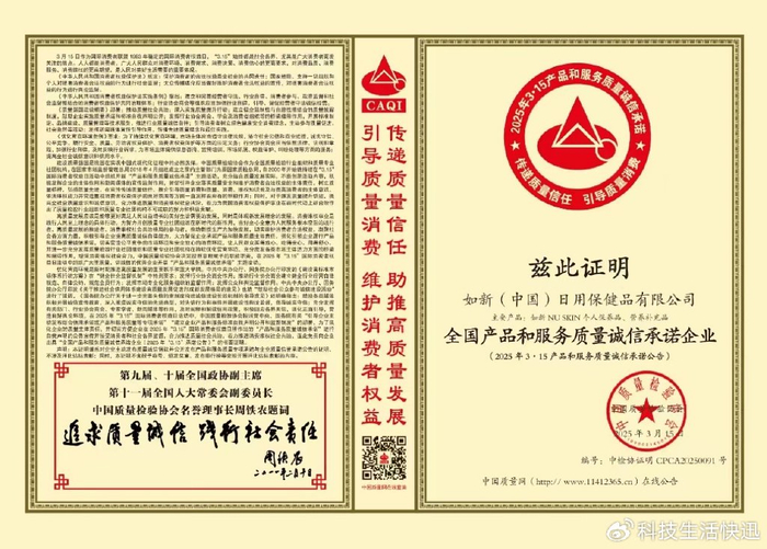 在2025年"315"国际消费者权益日之际,如新集团荣获中国质量检验协会颁发的"全国产品和服务质量诚信示范企业"荣誉称号。这一殊荣是对如新四十余年来坚持品质至上理念的权威认可,彰显了其在美丽健康产业的领军地位。