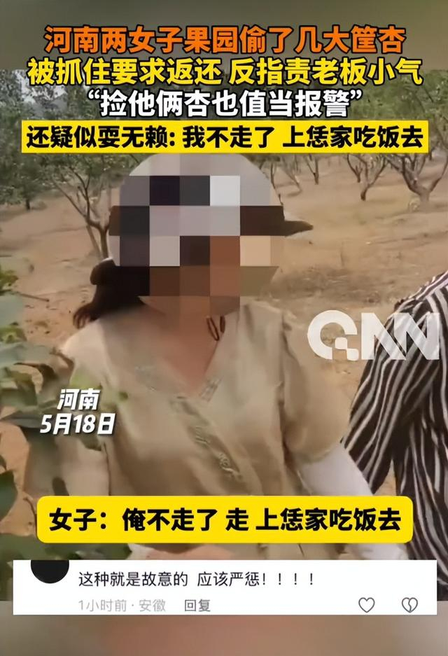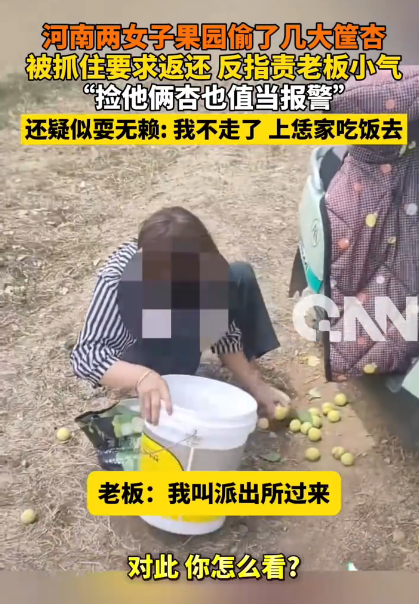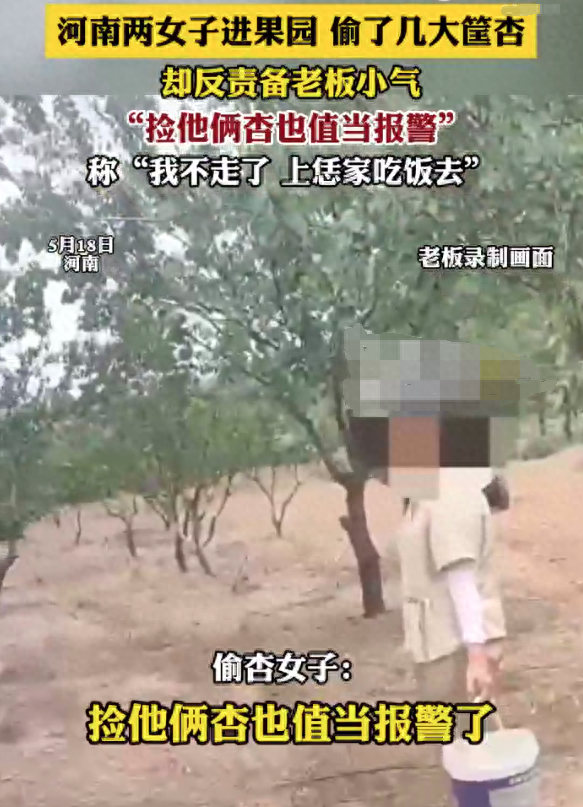 5月18日,在河南某果园里,两名女子骑着电动三轮车,手持塑料桶,麻利地摘下几大筐新鲜杏子。正当她们准备满载而归时,被果园老板抓了现行。面对质问,两人非但没有羞愧,反而理直气壮:“杏子是掉地上的,捡点咋了?”甚至威胁“不让走就去你家吃饭!”视频曝光后引发热议——为何偷东西的还能如此嚣张?
