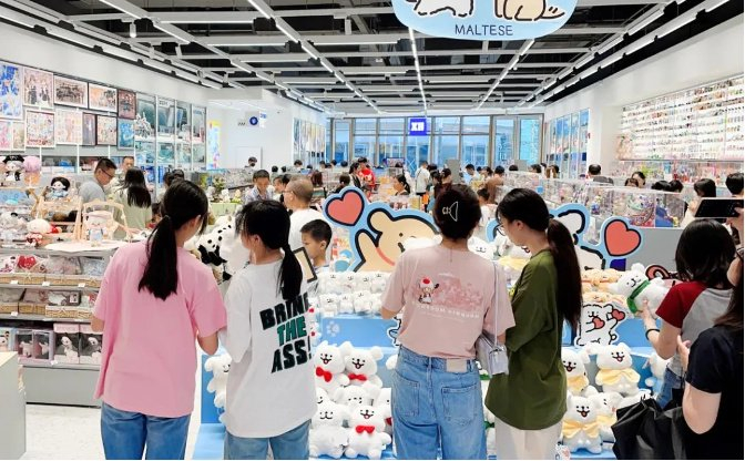 比如,来自欧洲雪国瑞士的IP“Pingu”凭借可爱呆萌的企鹅造型,在国内外社交平台上获得众多网友喜爱。KKV看中这一IP在年轻群体中的影响力,联合“Pingu”打造了一系列爆品,不仅开发了超100个SKU,涵盖潮玩、日用、服饰等多品类,更在东莞壹号广场、武汉楚河汉街等城市中心商圈落地“Pingu主题店”,让消费者能第一时间体验和购买新品。