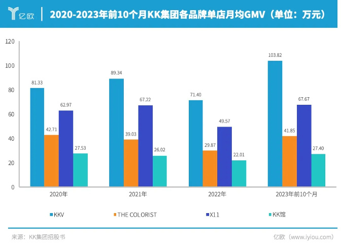 招股书亦显示,2020-2021年,主力品牌KKV单店月均GMV(即商品交易总额)分别为81.33万元、89.34万元,2022年受外部因素影响下滑至71.40万元,2023年前10个月单店月均GMV增长至103.82万元,创下公司单店月均GMV的最高纪录;此外X11也创下单店GMV新高至67.67万元,调色师单店月均GMV回升至41.85万非常接近2020年的水平。