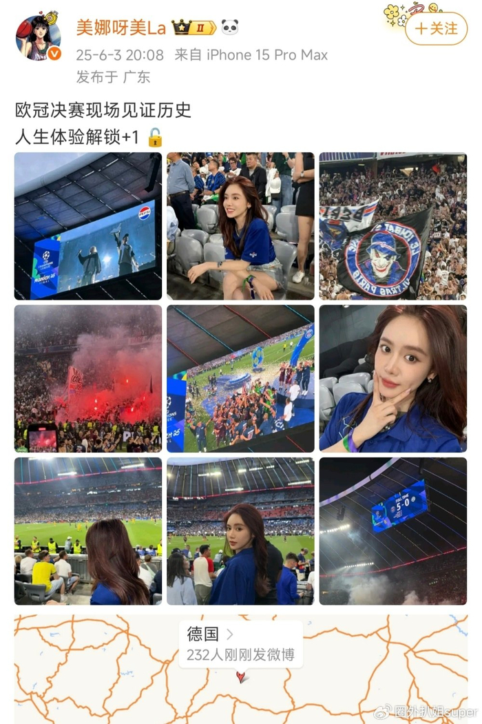 今晚,美娜自传闻出现之后首次更新社媒,发文称:“欧冠决赛现场见证历史 ,人生体验解锁+1。”还配上了自己在慕尼黑安联球场现场观看本赛季欧冠决赛的照片,而这场决赛,巴黎圣日耳曼5-0大胜国米,首次夺得欧冠冠军。
