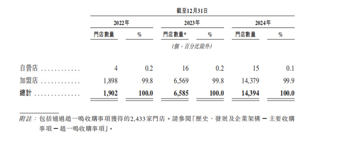 鸣鸣很忙是很纯粹的加盟商模式,招股书中显示截止2024年自营店仅有15家,甚至比去年还少了一家。