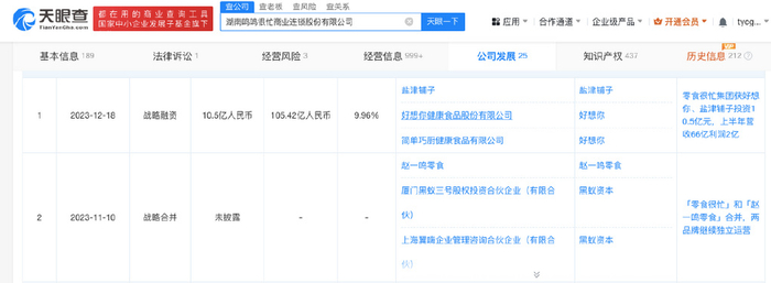 根据天眼查APP数据显示,2023年11月,零食很忙收购赵一鸣零食,宣布战略合并更名为鸣鸣很忙。