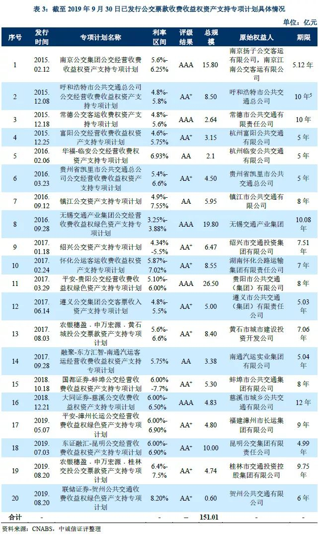 根据CNABS所获得的数据,截至2019年9月30日交易所市场成功发行的以公交票款为基础资产的资产支持专项计划合计20单,合计发行规模151.01亿元。具体情况如下表所示: