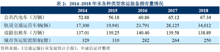 车辆供给方面,车辆的供给往往与线路供给相辅相成。2014~2018年,公共汽电车装备拥有量年均复合增长率为6.23%,2018年末全国拥有公共汽电车67.34万辆;按车辆燃料类型分,2018年末柴油车占22.20%,天然气车占24.50%,混合动力车占12.90%,纯电动车占37.80%,随着响应国家绿色交通发展的理念,传统柴油车占比逐年下降,纯电动车占比逐年增长;同期,轨道交通装备拥有量年均复合增长率为18.41%,2018年末全国拥有运营车辆34,012辆。