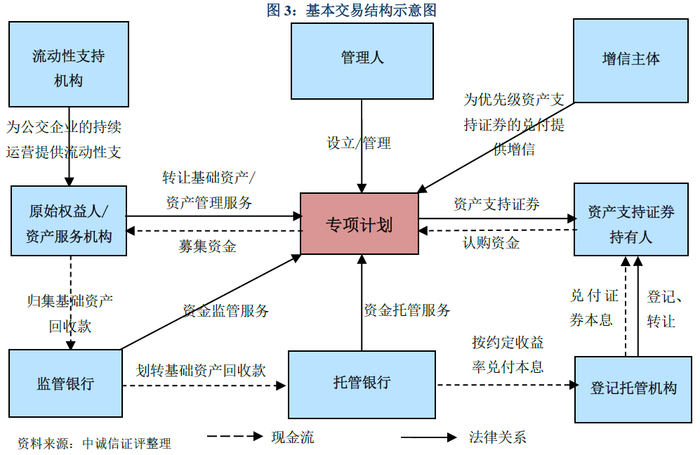 产品交易结构是资产证券化产品设计的重要一环。公交收费收益权资产证券化项目属于收费收益权项目中的一类,交易结构已日臻成熟。该类产品参与方主要为原始权益人、管理人、监管/托管机构和增信主体等,常见结构如下图3。