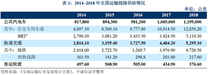 线路供给方面,随着我国经济的持续快速发展,城镇化进程持续推进,公共汽电车和轨道交通覆盖范围随之增长。线路总长方面,2014~2018年,公共汽电车运营线路总长度年均复合增长率为10.04%,2018年末运营线路总长度119.90万公里;同期,轨道交通线路总长度年均复合增长率为17.10%,2018年末运营线路总长度5,295.10公里;线路数量方面,2014~2018年,公共汽电车运营线路年均复合增长率为7.69%,2018年末运营线路60,590条;轨道交通运营线路年均复合增长率为16.76%,2018年末运营线路171条。