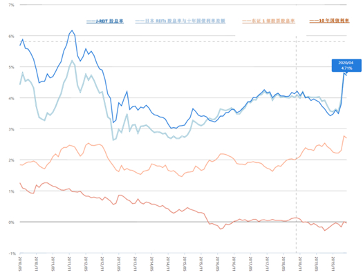 日本REITs分红来源主要有两个,一个是税法计算的净收益,另一个是超额分配(如将折旧部分进行分配)。从收益表现来看,日本平均REITs股息率保持在4-5%左右,在全球市场中属于适中水平。