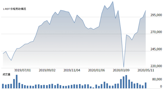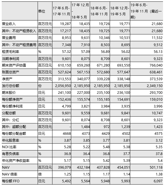 从技术指标来看,伴随公司运营资产规模的增加,资产总估值提升,NAV增长迅速,于此同时,虽然租赁毛利率小幅收窄,但每份额FFO保持增长,同时NOI比率稳定,综合影响下,对股价提升起到推动作用,最新一期期末每股价格上涨至293,700日元,但需关注到两个方面:(1)虽然公司融资成本极低,但由于公司在杠杆使用方面谨慎,导致权益投资人收益率杠杆效应一般,这是发行人在财务稳定性和收益性方面进行权衡的结果;(2)虽然公司每份额FFO增长,但由于公司对于利润的超额分配部分具有分配比例的选择性,单位份额分配额在18年12月-19年5月,19年6月-11月连续两个结算期内增长乏力,而在股价抬升的综合作用下,导致最近一期股息率大幅下挫至3.12%,且19年6月-11月结算期内,公司进行了增发,稀释效应也使得单位份额股息增长承压。公司于19年11月底 NAV倍率创近五期新高,达到1.38倍,在股息率偏低的情况下预示当期末股价可能已存在偏高迹象。因此,考虑最新结算期NAV倍率已经涨至1.38倍,在290000-30000日元区间买入公司份额存在股息率偏低的风险,而在220000-250000这一区间(对应股息率约4%左右),成交量明显放大(详见下图),NAV倍率适中,投资价值显著提升。