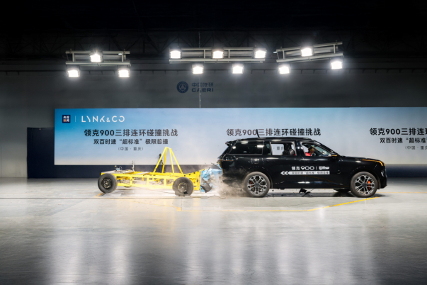 在央视新闻和中国汽车工程研究院的共同见证下,领克900进行了中国首次双百时速连环碰撞测试。测试内容包括100km/h高速尾部碰撞和100km/h侧面碰撞。测试结果显示,领克900的乘员舱结构保持完好,生存空间充足,车门正常解锁,高压系统断电正常,各项功能运行正常。这次测试验证了领克900在极端碰撞情况下的安全性能。