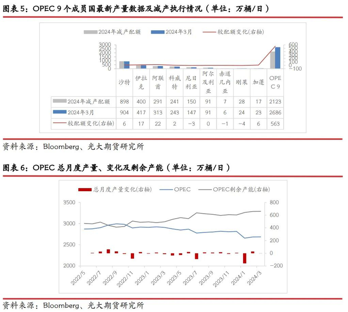 其次,冲突也可能波及中东其他核心产油国,或进而影响OPEC+的减产政策。去年底OPEC+宣布220万桶/日的自愿减产政策,从执行情况来看,据Argus数据统计,OPEC+受减产目标约束的18个国家(包括俄罗斯等)3月的最新产量数据约为3459万桶/日,比目标高出27万桶/日,2月的产量比目标高出19万桶/日。沙特和阿联酋在过去一年的时间中承担了OPEC+减产的大部分配额,在上个月小幅增产之后,产量水平整体略高于目标。当前OPEC组织的剩余产能已超过600万桶/日,在今年以来国际油价不断走高的背景之下,如果中东部分国家(比如伊朗)供应发生中断,那么其余OPEC+的减产政策可能会发生一定变化。