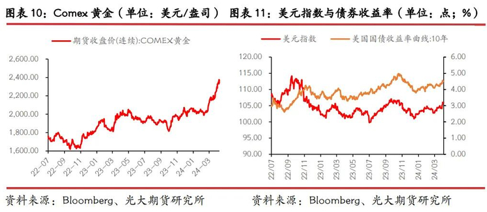 从短期来看,美联储开启降息之前,美元指数仍将偏强运行,而过高的金价将使得后续入场的资金保持观望状态,若地缘局势进入稳定期,金价或维持高位震荡走势。从中长期来看,美联储的降息前景仍是黄金价格走向的主导因素。只要美联储的宽松预期不发生大的转折,金价仍将大概率保持整体向上的走势。除此之外,下半年将会迎来的的美国总统大选,若特朗普再度执政,为避免受到制裁威胁,增强应对外部冲击的能力,其他国家尤其是新兴市场国家将可能加快在美国的黄金储蓄转移,这也将对黄金价格形成扰动。