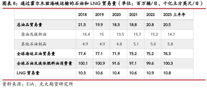 最后,市场依然担忧事态扩大导致霍尔木兹海峡被封锁的可能性。霍尔木兹海峡连接波斯湾、阿曼湾和阿拉伯海,是世界上最重要的石油运输通道之一。据EIA统计,2022年,其平均石油运输量约为2100万桶/日,相当于全球石油液体消费量的约21%。2022年和2023年上半年,通过霍尔木兹海峡运输的石油占全球海运石油贸易总量的四分之一以上;此外,全球约五分之一的LNG贸易也通过霍尔木兹海峡;通过霍尔木兹海峡的石油产品有82%流向了包括中国、印度、日本和韩国在内的亚洲市场。目前仅有沙特和阿联酋拥有可以绕过霍尔木兹海峡的管道,产能分别为500万桶/日和150万桶/日。EIA预计如果霍尔木兹海峡被封锁,则这些管道能分流约350万桶/日的石油贸易量。如果当前地缘局势升级到这一地步,那么对于全球石油供应将产生实质性影响,但从各方表态来看,均不希望事件有进一步扩大,因此我们认为该种情况发生的可能性较低。