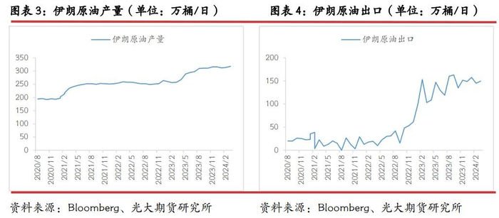 伊以冲突的升级使得市场再度开始担忧中东地区原油供应受到扰动的风险。由于以色列并非主要产油国,因此伊朗对以色列发动的无人机和导弹袭击并未对原油供应造成实质性影响。当前市场关注的焦点在于以色列对伊朗袭击的潜在反应。从此次事件的脉络来看,伊朗此次袭击主要是针对以色列4月1日轰炸其驻叙利亚大使馆的一次性报复,在袭击发生前已有预警,因此并不意味着事态出现显著升级,这也符合此前伊朗的表态以及市场预期。但是以色列的回应仍然值得关注,首先,伊朗作为中东的主要产油国之一,目前最新的原油产量约为318万桶/日(占全球供应量的3%),在过去两年里增加了约60万桶,增幅超过20%,这主要源于美国对伊朗制裁在一定程度上的放松,目前伊朗原油出口也回升至近150万桶/日,较此前低点增加超过100万桶。如果以色列对伊朗境内的石油设施进行打击报复,市场定价伊朗供应减少的可能性更大,那么这可能会导致地缘政治风险溢价更高。
