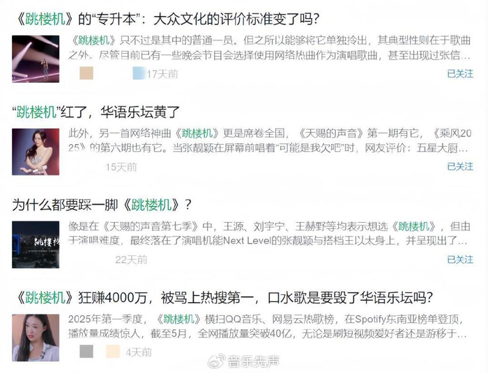 就在前不久,张靓颖与王以太在音综的舞台上翻唱了《跳楼机》,而就在同期这首节目组看中的破亿神曲也引发了全网质疑,歌词被群嘲土、low、像“非主流QQ签名”,旋律和编曲也被调侃“一顿吃了几个周杰伦”。