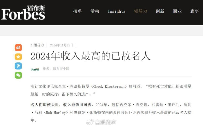 虽然很少有公开数据佐证成本控制和音综选歌选人之间的直接关系,但“经费在燃烧”经常漂在音综的弹幕上,乐迷也经常戏称周杰伦、林俊杰、阿信仅凭版权收入大可躺赢,《福布斯》“已故名人收入排行榜”上Michael Jackson等音乐人常年居TOP3,这些零散的信息中也不难管中窥豹。