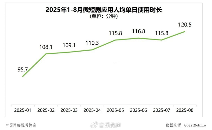 2024年,微短剧市场规模首次突破500亿元。根据最新调研,整个行业正加速向千亿级市场规模迈进,发展势头迅猛,预计今年内有望接近千亿大关。《中国微短剧行业发展白皮书(2025)》显示,2025年1-8月,微短剧应用的人均单日使用时长达到120.5分钟,较1月增幅达25.9%。